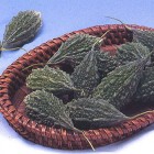 Momordica charantia (Engels: Balsam-Pear, Bitter Gourd) Klimplant uit de tropen, geeft korte, sierlijke donkergroene, zachtbittere vruchten met een lengte van ongeveer 7-10cm. Een bekende in de Surinaamse- en Indische keuken. |