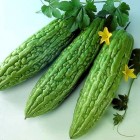 Momordica charantia (Engels: Balsam-Pear, Bitter Gourd) Deze klimplant uit de tropen geeft middenlange, lichtgroene, bittere vruchten met een afmeting van ongeveer 25-30 x 5-10 cm. De huidstruktuur is glooiend gebobbeld. Een bekende in de Surinaamse-, Keniase- en Indische keuken. |