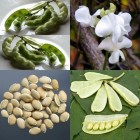 Dolichos lablab (Engels: Hyacinth Bean) Sierlijk, klimmend peulgewas voor een zonnig plekje buiten of in de kas. Deze vlinderbloemige bloeit in het mooiste helderwit in lange bloemtrossen met heldergroen blad en wordt als sierplant (eenjarig) enorm gewaardeerd, niet in de minste plaats omdat nog niet veel mensen dit gewasje kennen. Voor de moestuinier: na de bloei groeien korte, frisgroene peultjes met een aangename zachtzoete smaak, populair in Azië! Jong plukken, kort koken of smoren in bijv. Tarkari (Surinaams gerecht). De droge boontjes |