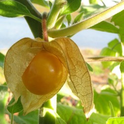 Een bijzonder eetbaar familielid van de bekende oranje lampionplant. De plant wordt ruim 1m hoog, na de bloei ontstaan de lampionnetjes met de aromatische zoete, oranjegele besjes. De smaak heeft een mix van ananas, aardbei en tomaat met een klein bittertje. Oogstbaar als de omhulsels vergelen, daarna vrij lang houdbaar.