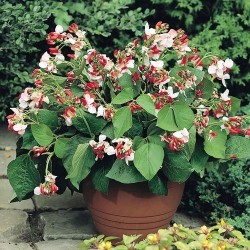 De prachtige rood-witte bloei pronkt allereerst. Spoedig volgt een goede oogst van draadloze gezonde pronkbonen. Een ideaal ras voor kleine plekjes, teelt in potten of gewoon in de siertuin..…