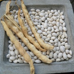 Onze kweker vertelde het volgende mooie verhaal: de bonen heb ik ongeveer in 1970 gekocht op een landbouwbeurs in Warffum. Een oude man maakte me er op attent, hij vertelde me over deze ‘Oldambster Witte’ (spreek uit: ol-dambster). De groene peulen laat je drogen aan de plant tot ze wit zijn. Vervolgens kunnen ze gedopt worden, goed drogen, een weekje in de vriezer (tegen het uitkomen van de eitjes van de bonenkever) en vervolgens koel bewaren. Het is in Groningen een delicatesse en met Nieuwjaarsdag worden ze uit traditie gegeten, verder de hele winter door. (commentaar: Grappig, deze traditie komen we ook tegen in de VS met de Cow Peas, ook een soort droogboon). Deze “Grunninger Dreuge Boon” maken we als volgt klaar: oudejaarsdag in de week zetten, ‘s morgens even afspoelen, tegen 11.00u op een zacht vuur zetten met een stuk spek, verse worst en een droge bink (gepekeld bovenbeen van het varken). Zonder de droge bink moet er wel wat zout bij, samen met een meelderige (=bloemige) aardappel is het een koningsmaal!