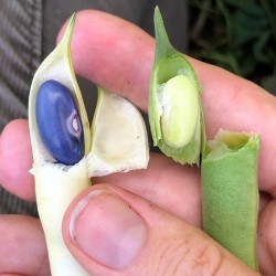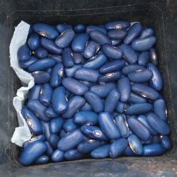 Een zeer vruchtbare, klimmende boon, waarvan je de peulen vers kan doppen (als een flageoletboon) of geheel droog kan oogsten. De verse boontjes zijn helderblauw, verwacht 6 boontjes per peul en de droge boontjes worden bijna zwart en zijn dan uiteraard lang te bewaren. Deze prachtige, roze bloeiende boon is door spontane kruisingen ontstaan op het seedsaver veld van Lisa Bloodnick in Apalachin (Bloodnick Farm). Onze Nederlandse kweker vermeerderde het ras verder voor ons... Na enig experimenteren vond Lisa in 2018 dat het ras zuiver genoeg was. Het was een erg nat jaar en ‘Sacre Bleu’ bleek als enige nauwelijks last te hebben van schimmel, wat een prettige eigenschap is voor een boon, die geheel rijp moet worden geoogst! ZaaimethodeZaaien: mei-juni aan de voet van stokken of andere klimmogelijkheid (2 m). Voorzaaien in potten mag ook. 5 zaden per stok. Bonen houden van warmte, zaai niet te vroeg en niet met veel regen op komst. Tip voor het opslaan van droge bonen: om uitkomen van eventuele eitjes van de bonenvlieg te voorkomen plaatst u de goed gedroogde bonen 24 uur in de vriezer. Leveringsmaandenhet gehele jaar