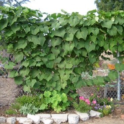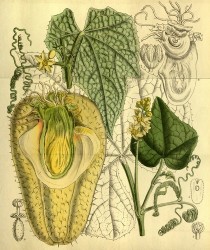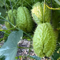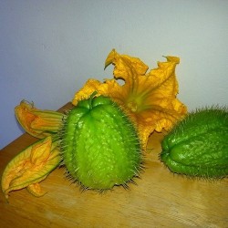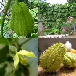 Een vreemde eend in de zaden-bijt vormt dit familielid van de komkommers (Cucurbitaceae)! Ik introduceer de term “naaktkiemer”, want dit fantastische zaad kiemt in de loop van de winter gewoon (binnen!) uit zijn eigen vrucht, dit is dan ook de enige kiemmethode! Bewaar deze prachtige, grofgestekelde vrucht (er bestaat ook een fijngestekeld ras) dus op een lichte, niet te warme plaats. In de warme kamer mag ook, maar dan moeten de scheuten af en toe gesnoeid worden. Vanaf februari-maart is het beter om de groeiende vruchten in potten te planten (eerder mag ook): geheel onder de grond of op zijn kant, zo dat de uitloper in elk geval net onder de grond is geplant. Water naar behoefte, aarde droog = water geven. Bij mooi weer af en toe met de plant naar buiten is gunstig voor een stevige groei. Uiteindelijk moet de plant (na de vorstperiode dus ongeveer in mei) lekker in de zon naar buiten en uitgeplant worden in de vollegrond. Deze zal aan de klimmende of kruipende ranken in zomer en herfst een enorme oogst geven. Er bestaan ook Chayotes met een gladde schil (060405), deze zijn net zo smakelijk, ze doen het beide goed in ons klimaat, het ene jaar doet de gladde het beter, het andere jaar juist de gestekelde... Over de bereiding van deze Midden-Amerikaanse vrucht vind je veel ideeën op internet. Opvallend is, dat de zachte structuur behouden blijft, je bakt of kookt ze dus niet tot moes. Vergelijk de smaak met die van een sappige aardappel, je kan er dus mee koken, bakken, maar ze kunnen ook rauw gegeten worden met een beetje citroen en wat zeezout...! De gehele plant is overigens eetbaar: bloemen, bladeren, groeischeuten en wortelknollen. De plant vormt mannelijke (10-30 bij elkaar) en vrouwelijke (solitaire) bloemen aan 1 plant, eenslachtig en eenhuizig dus.