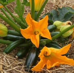 Courgettes kunnen probleemloos buiten worden geteeld. Dit ras rankt niet, de vruchten groeien vanuit het centrum van