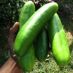 Op voorspraak en verzoek van een klant (dank je Teus) is deze komkommer deel van de Vreeken-collectie geworden. Zijn verhaal: de Hoffmanns Giganta (de oude benaming voor Hoffmanna Johanna) is een gemakkelijk groeiende en zeer productieve komkommer voor de volle grond. De vruchten zijn groot en zwaar, 40 cm lang en 10 cm dik is geen uitzondering. Het vruchtvlees is stevig en de smaak is goed. Een nadeel is dat er soms bittere vruchten tussen kunnen zitten. Weet jij trouwens wat de oorzaak van de bitterheid kan zijn? Volgens mijn opa vroeger kwam het door trappen op de ranken, maar dat heb ik nooit kunnen bewijzen.” Mijn aanvulling: bitterheid is een genetische eigenschap, die soms voorkomt bij oude landrassen. Je kan het al vroegtijdig ontdekken. Als je de jonge planten topt kan je het topje proeven. Zeer bittere toppen geven bittere vruchten. Het trappen op de ranken heeft geen invloed op de bitterheid…