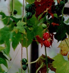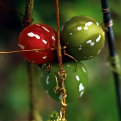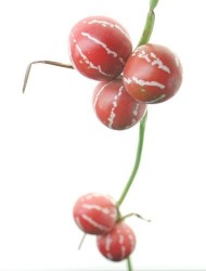 Bijzonder decoratief vruchtje, zo groot als een druif in trossen van 3-6 vruchtjes, die overigens niet eetbaar zijn. De kleur van de gladde vruchtjes is donkergroen met lichtgroene streepjes, later verkleuren ze naar felrood, leuk voor de kerst.