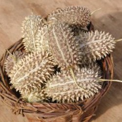 Afrikaans komkommertje, o.a. bekend onder de naam Okalopolola. Groen gemarmerde, grof gestekelde (maar niet prikkende) vruchtjes, ongeveer 5-7 cm lang en 3-4 cm dik. Leuk voor de herfsttafel! In Afrika wordt het blad gekookt of geroerbakt. Deze is bittervrij. De vrucht is alleen voor de sier.