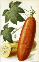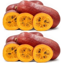 Dit zeldzame lid van de komkommer introduceren we zonder veel kennis over de teelt. Jullie hulp roep ik in om ermee te experimenteren, het resultaat zal een grote beloning voor je zijn! De klimplanten groeien snel en kunnen in de tropen wel 15 m lang worden. Hoe groot dat binnen ons klimaat zal zijn weten we (nog) niet. Mijn idee is om zowel buiten als in een kas te experimenteren, zaai de planten heel vroeg in het voorjaar en laat de eerste teelt in huis plaatsvinden tot het warm genoeg is. Op een zeker moment zal de plant wit of geel gaan bloeien, vooral veel mannelijke bloemen en hopelijk ook snel vrouwelijke bloemen. Die laatste zijn herkenbaar aan het vruchtbeginsel direct achter de bloem. De langwerpige vruchten die daarna volgen zijn onrijp als courgettes te eten, maar ik zou ze eerst eens helemaal rijp laten worden. Per plant is de verrassing welke kleur de glanzende vruchten gaan worden: donkergeel, oranjerood, kastanjebruin, violet, donkerpaars of (bijna) zwart. Snij de vrucht open, lepel de zaden met omringende pulp eruit en geniet van het heerlijk zoete, gele vruchtvlees! Smaakbelevingen zoals een mix tussen meloen, komkommer, banaan en sinaasappel. ‘’ Het kan zijn dat de vruchtzetting laat in het jaar begint, als de dagen korter worden. Ook kan het zijn, dat de planten pas het volgende jaar gaan vruchtzetten. Ik weet niet hoeveel kou de plant kan hebben, maar voor de zekerheid: snoei de plant geheel terug, bouw een tentje van stokken rondom de plant en wikkel er (voordat de vorst komt) noppenfolie en/of acryldoek omheen. We zijn benieuwd naar jullie bevindingen!