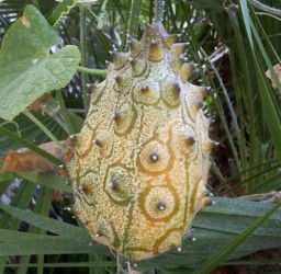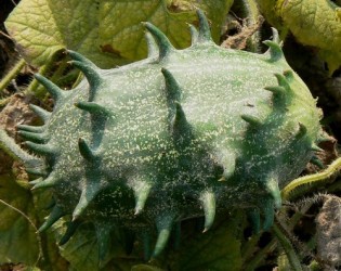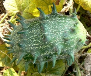 Dikke ovale vruchten met stekels aan de buitenschil, in eetbare toestand geelgroen van kleur (10x15cm). Het zeer sappige vruchtvlees smaakt naar komkommer. U eet ze zo: in tweeën snijden, vruchtvlees uitlepelen, beetje zout en citroensap erbij, tomatenschijfjes.. heerlijk! Het klimmende of kruipende gewas is zowel in de kas, als beschut buiten te telen. Vruchten blijven maanden goed.