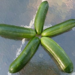 Mini-komkommer van het Midden-Oosten of mediterrane type. De schil is heldergroene en de vrucht heeft een zachte, milde smaak met een verbazingwekkend zoet aroma en prettig knapperige textuur. Niemand hoeft het Amerikaanse heirloom type komkommer te kweken (donkergroen, hobbelig, vatbaar voor bitterheid) als er heerlijke edelstenen zoals deze zijn. De dunne schil is opmerkelijk zacht maar toch stevig en lang te bewaren. De 10-20 cm komkommers kunnen klein worden geoogst om als augurken te worden ingemaakt. Doorgegroeid worden de vruchten geoogst voor salade of in snackblokjes. De planten geven een vroege en opvallend grote productie, zelfs bij koud weer. Deze selectie is ontwikkeld door Dr. Alan Kapuler van Peace Seeds in Corvallis, Oregon.