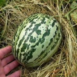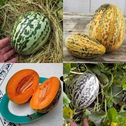 Echte Cantaloup (Cantalupensis groep) Zeer oude, mooie rassen. Typerend is de ruwe, gebobbelde of wrattige schil. De vrucht ademt een muskusaroma en -geur, het blad is gelobd en (vaak) hartvormig. Het vruchtvlees is oranje of groen en de schil altijd netvormig. Cantaloup (Nederlands: Kanteloep) is de Franse schrijfwijze voor het Italiaanse Cantaluppi, het landgoed van de pausen, waar in de vroege Middeleeuwen meloenen uit de toenmalig bereikbare wereld werden verzameld en geteeld. Deze bijzondere meloen komt uit 1 van de vele kruisingen tussen ‘Noir des Carmes’ en ‘Prescott a fond Blanc’. Allereerst valt de goede groeikracht in de vollegrond op, vervolgens overleeft de plant menige zomerse koudegolf en zelfs in de herfst blijft de plat goed intact en rijpen de vruchten prima af. Een goede kanshebber voor ons klimaat dus... De vruchten zijn ovaalrond, lichtgroen met donkergroene strepen (in rijpe vorm meer gele tinten) en oranje vruchtvlees. De smaak van goed aan de plant gerijpte vruchten is hemels en vele malen beter dan een gekochte vrucht in de winkel…