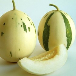 Wintermeloen (Inodorus groep) Na de oogst rijpende meloen, die lang bewaard kan worden. De vorm is rond tot (lang)ovaal, de schil is vrij glad, soms iets geplooid en/of geribd. De schilkleur varieert per ras van wit, geel tot zwartgeel gestreept. Het vruchtvlees is stevig en zoet in de kleuren wit, geel of oranje. Uniek meloentje! Lekker zoet, een handzaam maatje (1 kg) en vooral een prachtige kleur. De eivormige vruchten zijn crèmewit met groene vlekken en strepen, mooi voor de presentatie bij uw maaltijd, populair bij koks. Het meloentje rijpt tamelijk snel en is goed bestand tegen de gevreesde wortelrot. Teelt in de kas verdient voorkeur.