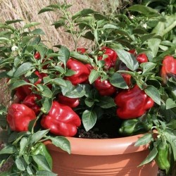 Een fantastische pot-paprika, de plant blijft compact (50 cm) en de vruchten zijn bijna net zo groot als een gewone (blok)paprika! Deze zijn heerlijk zoet-aromatisch en rijpen van groen, via paars naar rood. Hoe rijper hoe zoeter…