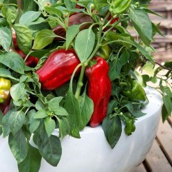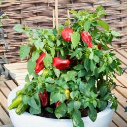 EEN TOPPER VOOR DE BUITENTEELT! Deze waarschijnlijk uit Oekraïne afkomstige paprika geeft zeer goede groei- en oogstresultaten (binnen en buiten de kas) in Noord-Europa. De compacte planten (50 cm hoog) met diepgroen, glanzend blad bloeien bij ons al vroeg waarna de lichtgroene, iets spitse, vruchten in groten getale verschijnen. Uiteindelijk rijpen de vruchten naar rood. De vruchtjes zijn vrij dikwandig en klein, ze wegen ongeveer 50-75 g per stuk.