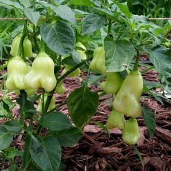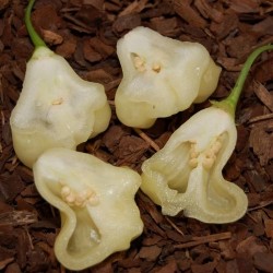 Dit geweldige, klokvormige pepertje teel je alleen al vanwege het uiterlijk en de bijzondere kleur! Aan de forse planten groeien volop helderwitte klokjes, die afrijpen naar crème. Peter Merle uit de Canarische Eilanden selecteerde en/of kruiste met de Finse peper Aji Fantasy en kweekte er de helderwitte kleur in... Een hebbedingetje pur sang en mild van smaak.