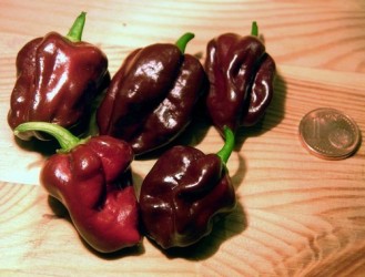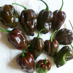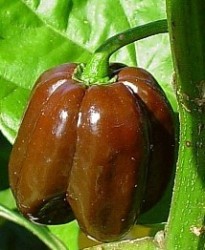 Mooie geblokte, kastanjebruine peper, iets ingedeukt hier en daar. Afmeting 5 cm lang en 3 cm breed. Het aroma is fruitig, iets gerookt. 250.000-425.000 SHU! Een hele hete dus!