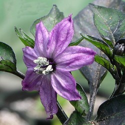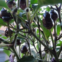 Zoals meer zwarte pepertjes tooit de plant zich met diep bruinzwart loof (hoe meer zon, hoe donkerder). Na de fraaie, lilablauwe bloemen groeit een grote oogst van kleine, iets langwerpige pepertjes. Rechtop aan de plant rijpen ze uiteindelijk tot karmijnrood. Dit ras is vrij heet.