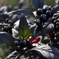 Alles is fraai aan deze peper: het zeer donkere blad, de lilablauwe bloei en de kogelvormige, bijna zwarte, glanzende pepertjes die rood narijpen. De planten blijven compact (50 cm) en de peper is uitgesproken heet!
