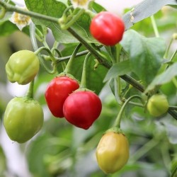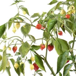 Deze Bulgaarse pepertjes hangen als druppels aan flink grote planten (in de kas wel bijna 2 m). Ze kleuren van lichtgroen, via zalm naar oranjerood. Een plant vol pepertjes geven een toverachtig effect. De complexe aroma’s hebben prettige zoete tinten. Matig heet 30.000 SHU
