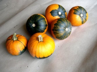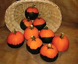 Een grappige verschijning, mits vroeg geoogst: de kleine, ronde vruchten (8cm in doorsnee, 100g in gewicht) zijn helder oranje met donkergroene helft. Later verkleuren ze naar oranje. Niet veel rankend