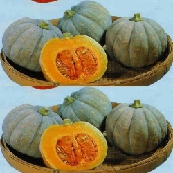 Prachtige vruchten met een doorsnee van 15-20cm en een gewicht van 1-2kg. Duidelijk geplooid, okergeel met een blauw-groen netwerk en beeldschone doffe waslaag. Dit lang bewaarbare hybride-ras is ziektebestendig.