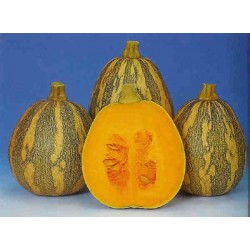 Pompoenen kunnen probleemloos buiten worden geteeld. De groeitoppen kunnen regelmatig worden gesnoeid en zijn eetbaar! Oogsten tijdens droog weer geeft de beste bewaarbaarheid. Alle pompoenen zijn eetbaar! Bij sommige soorten vermelden we de synoniemen, dat zijn de namen waaronder het soort ook bekend is. Bij andere soorten vermelden we zeer gelijkende soorten, heeft u duidelijk voorkeur voor een van die bij elkaar vermelde soorten, geef dat dan duidelijk aan. Ovaalronde vruchten, lijken sterk op de Mexicaanse ‘Mayo Kama’. Crèmegeel met donkergroene brede strepen. Het gewicht ligt tussen de 2-5 kg en deze hybride is goed bestand tegen meeldauw en virussen.