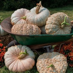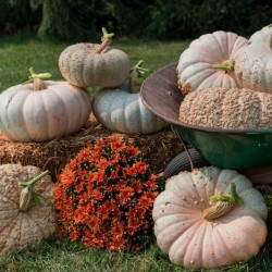 We zijn erg blij dat we het mooie sortiment van Outstanding Seed Company kunnen verkopen. Dit Amerikaanse bedrijf uit Beaver Falls (Pennsylvania) is gespecialiseerd in het kweken en verbeteren (door traditionele veredeling) van pompoenen. Ze letten daarbij op verbetering van kleur, vorm, smaak, ziekteresistentie, oogsttijdstip, oogstgrootte en bewaarbaarheid. Fijn om rechtstreeks bij de bron te kunnen kopen! Soms mogen “oudjes” even een vernieuwing ondergaan... We zijn er trots op, dat we deze sterke versie van de “Pindapompoen” (213510) kunnen introduceren! De vruchten hebben vaak een raster van kurkvormige versiering op de schil, die meestal uitgroeien tot grappige, pindavormige bobbels! De ondergrond van de vrucht kan variëren van blauwgrijs tot lichtroze, echt een sieraad, die ook nog eens een zeer goede smaak heeft. De planten geven een grote oogst van platronde vruchten (35 cm in doorsnee en 20 cm hoog), tijdens de groei is de kans op meeldauw zeer klein, waardoor de oogst lang kan doorgaan. De planten ranken ijverig en de vruchten zijn gemakkelijk enkele maanden te bewaren.