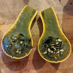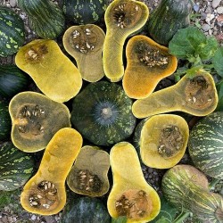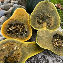 Pompoenen kunnen probleemloos buiten worden geteeld. De groeitoppen kunnen regelmatig worden gesnoeid en zijn eetbaar! Oogsten tijdens droog weer geeft de beste bewaarbaarheid. Alle pompoenen zijn eetbaar! Bij sommige soorten vermelden we de synoniemen, dat zijn de namen waaronder het soort ook bekend is. Bij andere soorten vermelden we zeer gelijkende soorten, heeft u duidelijk voorkeur voor een van die bij elkaar vermelde soorten, geef dat dan duidelijk aan. Ze mogen dan hun uiterlijk niet mee hebben, de smaak van deze flespompoenen is uitzonderlijk goed en uniek! Onze tuinvriend Gabriel uit Zwitserland heeft deze bijzondere vruchten voor ons vermeerderd. Van oorsprong komt dit ras uit Guatemala, het vruchtvlees is groenig en wordt zowel rauw gegeten als gekookt of gebakken. De smaak heeft ons weggeblazen: rauw proefden we hints van tropisch fruit zoals papaja of banaan. Gekookt komt de prettig zoete smaak zelfs nog beter tot zijn recht... We zijn trots en blij, dat deze unieke pompoen nu ook in Europa te bewonderen is!