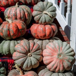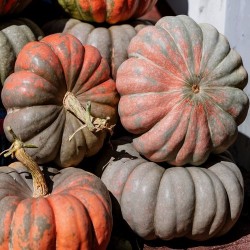 Weer een beauty met als toegift veel smaak en betrouwbare ziekteresistentie. De rankende planten dragen veel vruchten van 20-25 cm doorsnee en ongeveer 15 cm hoog. De pompoenen zijn prachtig paarsgrijs gemarmerd met perzikrood, sommige vruchten hebben verschillende tinten blauw tot grijs en veel vruchten zijn gespikkeld. Je kan de meeste van deze scherp geribde pompoenen goed stapelen, gemiddeld wegen ze 6-7 kg.