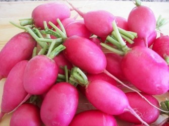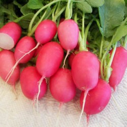 De naam verraadt als iets van dit fraaie radijsje: langwerpig van vorm (2x zo lang als de doorsnee) en zuiver roze van kleur. Een beetje standaard (maar wel raak!) om het een "damesslof" te noemen… Het knolvlees is helder wit. Dit aparte radijsje groeit evenals de ronde soorten gemakkelijk, in de zomer graag wat mulch, tot diep in de herfst blijft de knapperigheid behouden.