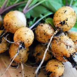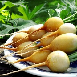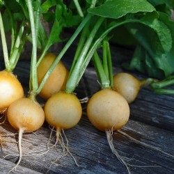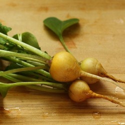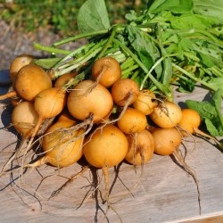 Wie kent ze nog: echte GELE radijsjes! Een radijsje, in de vorige eeuw in Zeeland zeer geliefd en in Polen en Rusland onverminderd populair. De smaak is zachtheet.