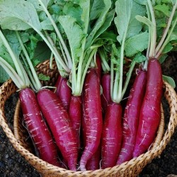 (20-30cm lang). De kleur is roze-rood en inwendig wit. Chinezen verwerken de schijfjes in bijv. roerbakgerechten, en soepen. Voor late teelt geschikt. ZaaimethodeZaaien: februari-augustus op rijtjes in de vollegrond, op een rijafstand dat er net tussendoor gelopen kan worden. ‘s Zomers de grond mulchen voor voldoende vocht. Tussen de plantjes uitdunnen op 5 cm. Leveringsmaandenhet gehele jaar