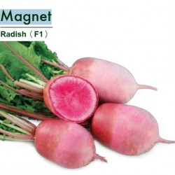 Wat een schoonheid! Deze grote Chinese radijs oogst je als de knollen 10 cm in doorsnee zijn, het bovengrondse deel van de knollen zijn knalrood, onder de grond verschuilt zich de lichtroze kleur. Het grote geheim geeft de knol prijs bij het doorsnijden: Van uit het centrum diep rozerood overgaand in wit en afgewerkt met een scherp rood randje: aantrekkelijk voor salades en fris, sappig en prettig pittig van smaak. Zaaien vanaf juni geeft overigens de beste resultaten.