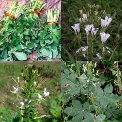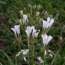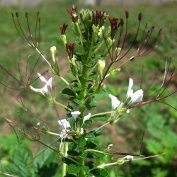 Sierlijk, eetbaar en medicinaal! Inmiddels is de plant in de hele tropen bekend, in India en Oost- tot Zuid-Afrika wordt de plant druk gebruikt: het jonge blad, de jonge scheuten en soms de bloemen worden verwerkt in roerbak-, stoof- of soepgerechten. De smaak is stevig en wordt vaak met melk of zure room verzacht. In India wordt deze sterke smaak gebruikt juist gebruikt in kerrie. De zaden zijn een vervanging voor mosterd, maar op het water gegooid komen de vissen boven drijven..! Van het blad wordt een versterkend en regulerend middel getrokken en de wortel wordt als pijnstiller gebruikt. Laat je al die toepassingen aan je voorbij gaan, dan blijft een mooie plant over met vingervormig blad en een subtiele, witte bloemtrossen, een familielid van de kattensnor. Hoogte 60-100 cm.