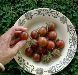 De kleinste tomaatjes in ons sortiment noemen we kerstomaatjes of pingpongtomaatjes, naargelang de grootte. Enkele variëteiten zijn langwerpig of hartvormig en krijgen navenant een iets andere benaming. Sommige zijn zelfs oorspronkelijke, wilde soorten. De meesten smaken extra zoet, een enkeling heeft een zoetzure smaak. Kerstomaten liggen het dichtst bij de oorspronkelijke soorten, wellicht daardoor zijn ze o.h.a. beter bestand tegen de gevreesde aardappelziekte. Dit is de eerste (bijna) zwarte kerstomaat die we hebben goedgekeurd voor ons sortiment. Het is een perfect ronde kersvorm met de klassieke zwarte-tomaten-smaak: zoet en toch rijk en complex. De stevige, hoge planten produceren in overvloed! Weer een unieke toevoeging aan het kleurenspectrum van de kerstomaten!