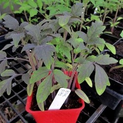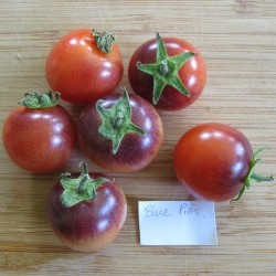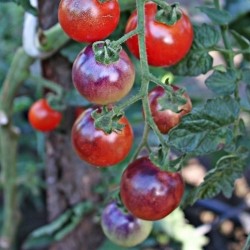 De kleinste tomaatjes in ons sortiment noemen we kerstomaatjes of pingpongtomaatjes, naargelang de grootte. Enkele variëteiten zijn langwerpig of hartvormig en krijgen navenant een iets andere benaming. Sommige zijn zelfs oorspronkelijke, wilde soorten. De meesten smaken extra zoet, een enkeling heeft een zoetzure smaak. Kerstomaten liggen het dichtst bij de oorspronkelijke soorten, wellicht daardoor zijn ze o.h.a. beter bestand tegen de gevreesde aardappelziekte. De verbazing begint al bij de jonge planten: Het blad kleurt purpergroen! De vruchtjes kleuren van groen, via geel en oranje naar dieprood, steeds met een dieper wordende blauwe hoed. Al die 5 kleuren sieren de plant tot een bonte pracht. Deze kerstomaat bewaart lang en de planten zijn zeer goed bestand tegen Phytophthora.