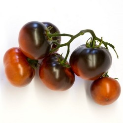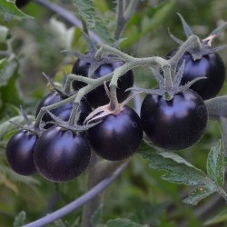 De kleinste tomaatjes in ons sortiment noemen we kerstomaatjes of pingpongtomaatjes, naargelang de grootte. Enkele variëteiten zijn langwerpig of hartvormig en krijgen navenant een iets andere benaming. Sommige zijn zelfs oorspronkelijke, wilde soorten. De meesten smaken extra zoet, een enkeling heeft een zoetzure smaak. Kerstomaten liggen het dichtst bij de oorspronkelijke soorten, wellicht daardoor zijn ze o.h.a. beter bestand tegen de gevreesde aardappelziekte. Prachtig diepblauw van boven en (eerst geel en later) rood onderaan de vruchtjes. Deze iets grotere kerstomaat heeft de goede smaak van een rood tomaatje in deze bijzondere blauwe kleur dankzij het hoge gehalte anthocyaan. Dit gezonde ras van Tom Wagner is een van de vele topresultaten van deze zeer vruchtbare kweker. De groei is tamelijk compact, we noemen dit een struiktomaat, ongeveer 100 cm hoog.