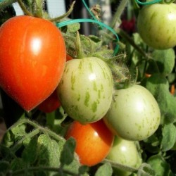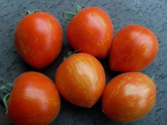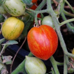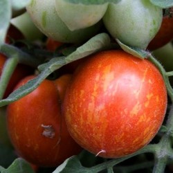 De kleinste tomaatjes in ons sortiment noemen we kerstomaatjes of pingpongtomaatjes, naargelang de grootte. Enkele variëteiten zijn langwerpig of hartvormig en krijgen navenant een iets andere benaming. Sommige zijn zelfs oorspronkelijke, wilde soorten. De meesten smaken extra zoet, een enkeling heeft een zoetzure smaak. Kerstomaten liggen het dichtst bij de oorspronkelijke soorten, wellicht daardoor zijn ze o.h.a. beter bestand tegen de gevreesde aardappelziekte. Geweldig mooie plant, compact van groei (30-60 cm hoogte slechts) en zowel de bladeren en de vruchten zijn sierlijk behaard. Ideaal voor potten, balkonbakken, vierkante metertuintjes etc. De rode, iets geel gemarmerde vruchten zijn wat verschillende in grootte, van zeer klein tot klein, zoet en zacht van smaak.