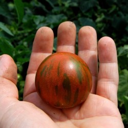 De kleinste tomaatjes in ons sortiment noemen we kerstomaatjes of pingpongtomaatjes, naargelang de grootte. Enkele variëteiten zijn langwerpig of hartvormig en krijgen navenant een iets andere benaming. Sommige zijn zelfs oorspronkelijke, wilde soorten. De meesten smaken extra zoet, een enkeling heeft een zoetzure smaak. Kerstomaten liggen het dichtst bij de oorspronkelijke soorten, wellicht daardoor zijn ze o.h.a. beter bestand tegen de gevreesde aardappelziekte. Een vroeg oogstbare rode, vrij kleine tomaat (pingponggrootte) met groene strepen. De smaak van de sappige vruchten is fruitig en aromatisch met een spannend scherp tintje. Heerlijk voor tomatensalsa!