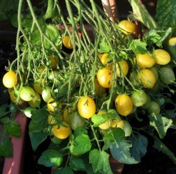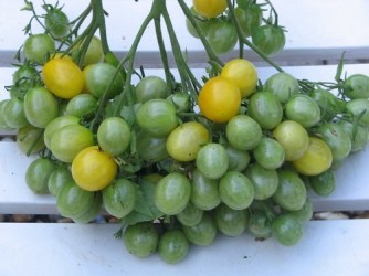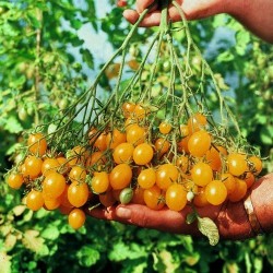 De kleinste tomaatjes in ons sortiment noemen we kerstomaatjes of pingpongtomaatjes, naargelang de grootte. Enkele variëteiten zijn langwerpig of hartvormig en krijgen navenant een iets andere benaming. Sommige zijn zelfs oorspronkelijke, wilde soorten. De meesten smaken extra zoet, een enkeling heeft een zoetzure smaak. Kerstomaten liggen het dichtst bij de oorspronkelijke soorten, wellicht daardoor zijn ze o.h.a. beter bestand tegen de gevreesde aardappelziekte. Kleine, lichtgele, druppelvormige kerstomaatjes. De plant vormt 3-4 enorme trossen met lekkere vruchtjes. De trossen hebben een grappige vorm, alsof de vruchtjes allemaal vooraan willen zitten... Zelftoppende plant. Hang een geoogste tros op een koel plekje, voor wekenlang snoepplezier!
