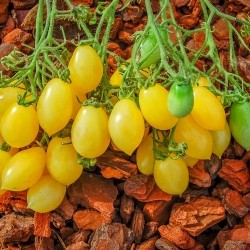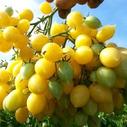 De kleinste tomaatjes in ons sortiment noemen we kerstomaatjes of pingpongtomaatjes, naargelang de grootte. Enkele variëteiten zijn langwerpig of hartvormig en krijgen navenant een iets andere benaming. Sommige zijn zelfs oorspronkelijke, wilde soorten. De meesten smaken extra zoet, een enkeling heeft een zoetzure smaak. Kerstomaten liggen het dichtst bij de oorspronkelijke soorten, wellicht daardoor zijn ze o.h.a. beter bestand tegen de gevreesde aardappelziekte. De klimmende planten met enorme groeikracht vormen enorme, brede trossen met gele vruchtjes, elk met een klein tepeltje. De zoete en zure smaken zijn mooi in balans, een echt smultomaatje!