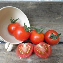 De kleinste tomaatjes in ons sortiment noemen we kerstomaatjes of pingpongtomaatjes, naargelang de grootte. Enkele variëteiten zijn langwerpig of hartvormig en krijgen navenant een iets andere benaming. Sommige zijn zelfs oorspronkelijke, wilde soorten. De meesten smaken extra zoet, een enkeling heeft een zoetzure smaak. Kerstomaten liggen het dichtst bij de oorspronkelijke soorten, wellicht daardoor zijn ze o.h.a. beter bestand tegen de gevreesde aardappelziekte. Een heerlijk kerstomaatje (15-20 g) met een mooie balans tussen zoet en zuur, dat al vanaf 1900 in cultuur is. De vruchtjes groeien in brede trossen, de klimmende planten kunnen vooral in de kas een enorme oogst geven.