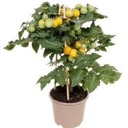 Sterke, ziekteresistente struiktomaat, die compact blijft en dus heel goed in potten of bakken geteeld kan worden! De gele, bolronde vruchtjes (8 gram) smaken friszoet en groeien aan korte trsojes rondom het hart van de plant. Je plukt de hele zomer verse kerstomaatjes.