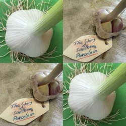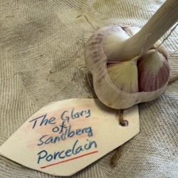 Knoflook is onderverdeeld in verschillende typen, dit is er eentje uit de Porcelain-groep. Torsten heeft ondervonden dat deze groep zich in Noord-Europa soms anders gedraagt dan zuidelijker. Die verschillen ordenen we in 2 "haplogroepen". De ene behoudt zijn groeiwijze stabiel in het noorden en de andere begint individuen te produceren met wel 6-7 tenen. The Glory of Sandberg is een zeer stijlvolle Porcelain-plant van het eerste groeitype. Torsten schrijft erover: Het uiterlijk van de plant is het mooiste dat ik ooit van Porcelain heb gezien en hij heeft zelden meer dan 4 grote tenen. Verwacht in Noord-Europa geen enorme opbrengst, maar deze variƫteit produceert de grootste bol in verhouding tot de groene massa van de plant. The Glory of Sandberg is mijn best bewaarde geheim en ik gun deze aan mijn knoflookvriend Ton Vreeken! ZaaimethodeKnoflook kan jaarrond worden geplant, als de teentjes in goede conditie zijn. De meeste rassen zijn in herfst en winter op voorraad. Wij voeren rassen, die succesvol in Nederland worden geteeld. Meteen na ontvangst de bol openbreken en de tenen in de grond poten: 2-5 cm diep en 10-20 cm uit elkaar. In het najaar geplant staat de knoflook in februari (of eerder) al boven en in juni-juli kunnen ze geoogst worden. Later geplant betekent uiteraard latere oogst. Oogsten is geen verplichting, knoflook is winterhard en kan ook gewoon in de grond blijven. Na oogsten het loof vlechten zoals je knoflook wel eens in de winkel ziet en de bollen in de zon drogen. In de kamer zijn ze soms wel een jaar te bewaren! De teelt is niet moeilijk, maar goede tips vind je in onze teeltbeschrijving in pdf (zie onderaan de website). Knoflook schijnt luizen in b.v. rozen te weren, het proberen waard! Leveringsmaandenseptember t/m januari