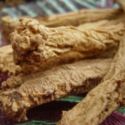 Een klimmertje met prachtige belvormige bloemetjes, bleek groenwit met purperen buitenkant. De wortels (pas na 3 jaar oogsten) worden net als van echte Ginseng gebruikt om er energie gevende tonics van te maken.