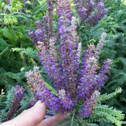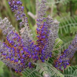 Alles is eetbaar aan deze plant uit de VS, maar het meest bekend is de eigenschap van de kleurstof indigo in de diepblauwe bloemetjes. Net als lavendel krijgt deze plant op den duur een houtige basis, die door snoeien (in het voorjaar) steeds wordt verjongd. De witgrijze stengels en fijngeveerde blaadjes geven al enorme sierwaarde. Bovenin bloeit deze 1m hoge plant met trosjes van langwerpige bloeiaren in diepblauwe kleur met grijswollige basis, kruidige geur! Goed winterhard, geef ze een niet te vochtige, wel zonnige plek. In de loop van de jaren wordt de plant hariger en grijzer. In het wild overleeft de plant door de diepe beworteling een brand gemakkelijk.