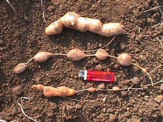De indianen van Noord-Amerika wisten dit gewas op waarde te schatten en het is onbegrijpelijk dat deze sterke plant niet al veel bekender is in Nederland! De klimplant heeft met zijn puntige gedeelde blad en de fantastische bloei een sierwaarde, die de in moestuin zeer welkom is! De lathyrus-achtige bloemen geuren heerlijk zoet en hebben een iets gedraaide vorm met een diepe kleurcombinatie: kastanjebruin, rood, oudroze en creme zijn verenigd in 1 bloem, ze staan aan dichte trossen. De geur leidt tot interessante discussies: zoet, kruidig en chocolade maar er zijn ook mensen die de geur niet waarderen. De late bloei (augustus-september) leidt niet tot zaadvorming maar is een mooie hekkensluiter van het bloeiseizoen. Vanaf november (het 2e of 3e jaar) mag het wonder worden opgegraven en zijn de knolletjes te rooien. Deze groeien als een ketting aan een lange navel en zijn na enkele jaren groei de moeite van het rooien waard. Om te uitbundige groei te voorkomen kan in grote kuipen worden geteeld. Goed vochtig houden en regelmatig bemesten! De smaak? Als een aardappel, dus koken, bakken, frituren, genieten.… Apios bevat een protease-remmer die volledig afgebroken wordt tijdens het verhitten. Het is dus zelfs niet nodig om het kookvocht weg te gieten, hoewel men in Bolivia dit wel doet, daar kkokt men de Apios in melk. Mijn kweker vertelt: “We eten ze al jaren als de perfecte vervanger van tamme kastanjes, bij de spruitjes of als “kastanjepuree”! ZaaimethodePlantafstand 30x30 cm. Oogst vanaf de tijd dat de plant bovengronds afgestorven is. Oogst alleen wat u wilt eten, de rest kan in de grond blijven of in een kist worden ingekuild met zand of aarde. Leveringsmaandenhet gehele jaar