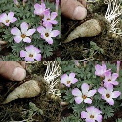 Het fraaie grijze klaverblad is in de lengte gevouwen. De lichtroze bloemetjes (met witte hartjes) knallen eruit. Ze houden van goed gedraineerde grond en groeien in het wild in het Andesgebergte (Patagoniƫ e.o.) van Chili en Argentiniƫ. De rijke bloei is van mei-augustus op 10 cm hoogte. De culinaire wereld is gek op dit gewasje: sierlijk en smakelijk is immers de ideale mix om gerechten een extra touch te geven! Zowel de blaadjes als de tere bloemen hebben een lichte fris-zure smaak. De oorspronkelijke bewoners van Zuid-Amerika aten van deze Oxalis vooral de conische knolletjes. ZaaimethodePlanten: meteen na ontvangst: jaarrond. Diepte: op 2-3x de bolgrootte. De bolletjes en planten zijn geheel winterhard. Leveringsmaandenvanaf september Gelijke productenDit product kent meer toepassingen en komt daarom in verschillende groepen van onze website voor. Dit product is ook te vinden als