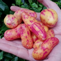 Gelukkig kennen steeds meer mensen dit bijzondere knolletje! In Zuid Amerika is het na de aardappel het belangrijkste knolgewas. Vooral rond het Andesgebergte (Ecuador, Peru en Colombia) is dit knolgewasje al eeuwen populair en in cultuur bij de Indianen. Net als de Yamboon behoudt de knol zijn knapperige textuur na het (kort) koken. Voor bakken of frituren zijn de knolletjes ongeschikt vanwege het hoge vochtgehalte. Het blad is eetbaar als spinazie, net als de zoete aardappel en de basella (van deze laatste is de Ulluco familie). De planten kruipen of klimmen met rankjes en zijn niet winterhard. Let op slakkenvraat, teelt op verhoogde bedden of in potten lukt erg goed vanwege de betere bodemwarmte. De oogst is laat in het najaar, enige bescherming met bijvoorbeeld vliesdoek helpt bij de knolzetting, vooral als september en oktober koud en guur zijn. 'Tiger' is geel-rood gestippeld en rond tot iets langwerpig van vorm.